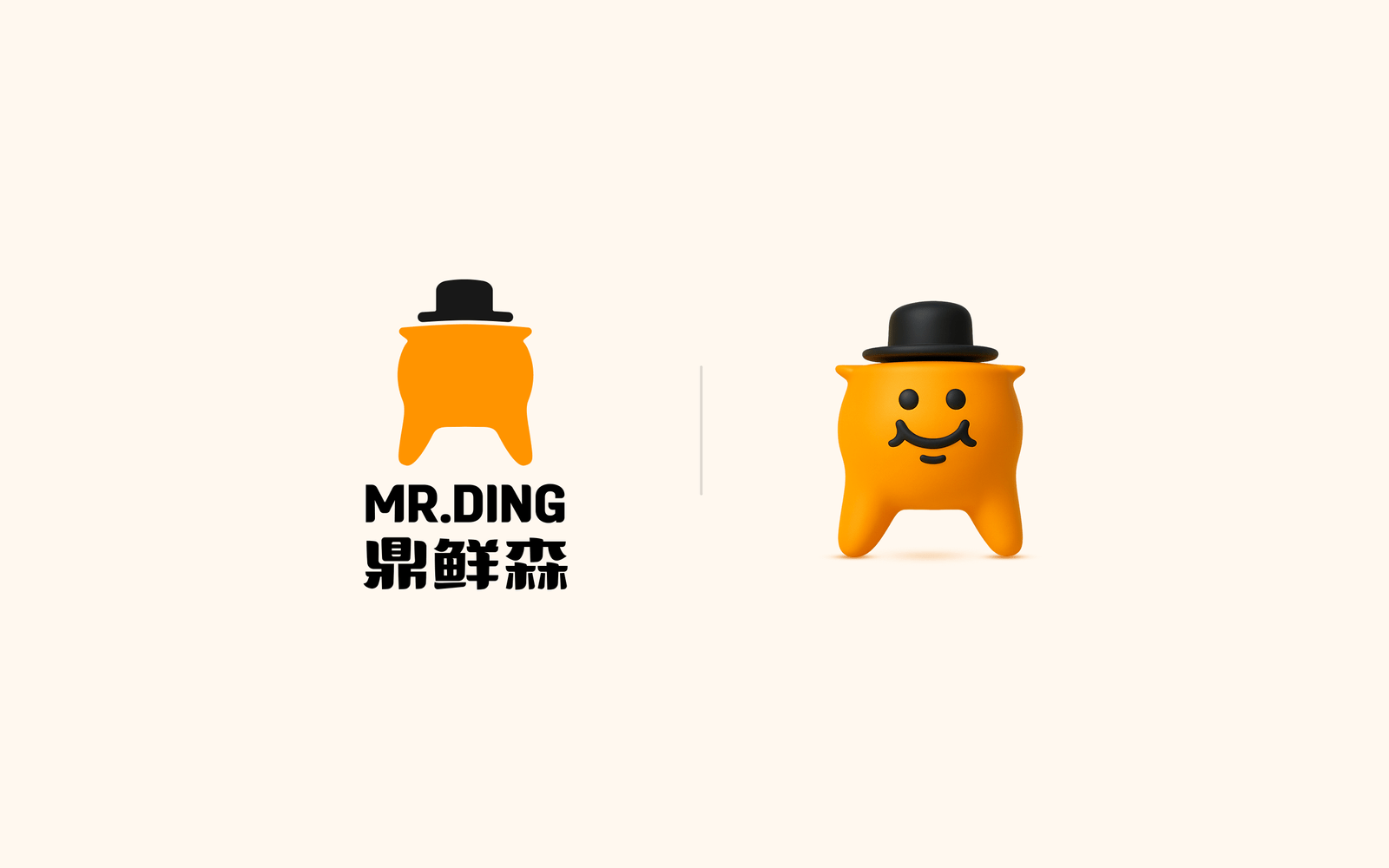 The logo design centers around the iconic “Ding” shape, simplifying the rounded contours of traditional cookware into a modern geometric silhouette. A bowler hat is placed atop, giving rise to the personified figure “Mr. Ding.” The overall form is stable yet friendly, with four legs naturally grounded, symbolizing reliability, warmth, and a steadfast dedication to flavor. The Chinese and English logotypes are arranged in symmetrical balance, with bold, weighty typography that conveys trust and professionalism in the food industry.
