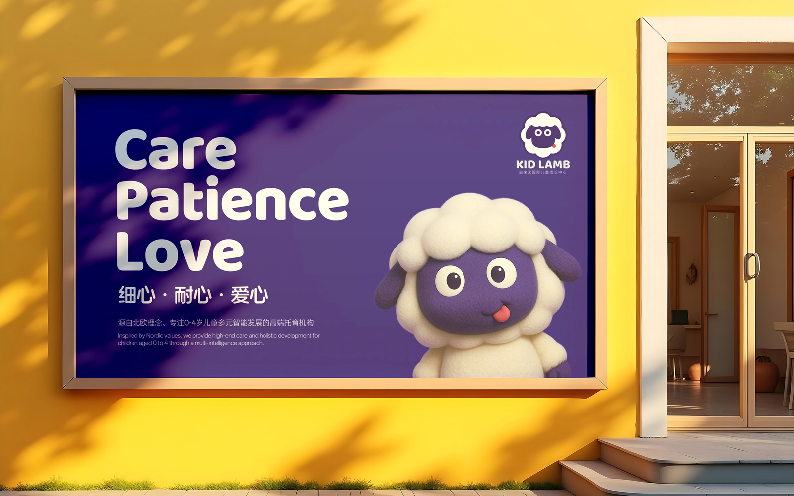 The outer silhouette adopts the shape of soft, full petals, symbolizing the idea that “children are the blossoms of the nation,” while also reflecting the brand’s focus on early education. The lamb’s face contrasts deep purple and white to ensure strong visual recognition—stable in form, yet full of playfulness.